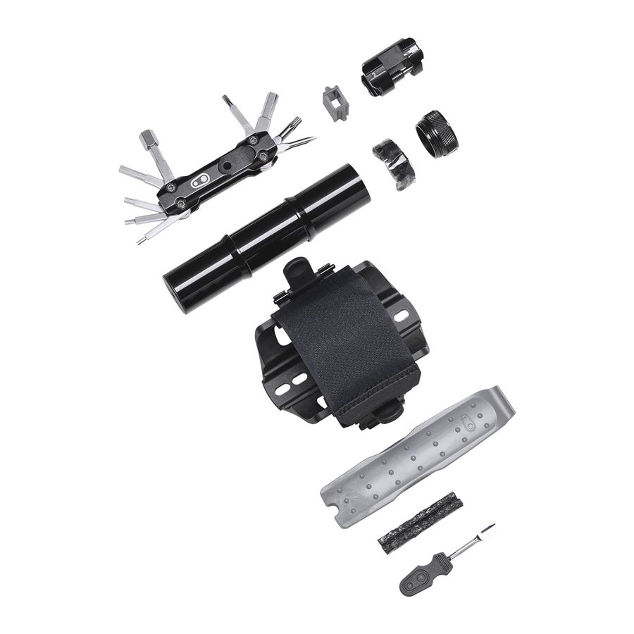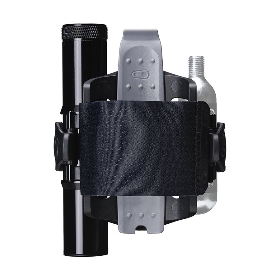 Držák náhradní duše nebo dalšího vybavení s páskem na suchý zip. Montáž místo košíku. V bočním úložném prostoru našlo místo velké multifunkční nářadí a na druhou stranu košíku je možné připnout CO2 bombičku nebo minipumpu.