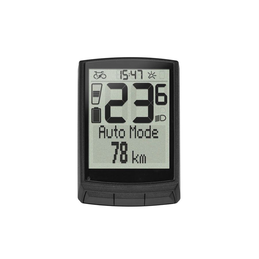 zobrazuje tyto informace o jízdě: aktuální rychlost, čas jízdy, denní a celková ujetá vzdálenost, výkon jezdce (ve Wattech), kadence, kalorie, teplota