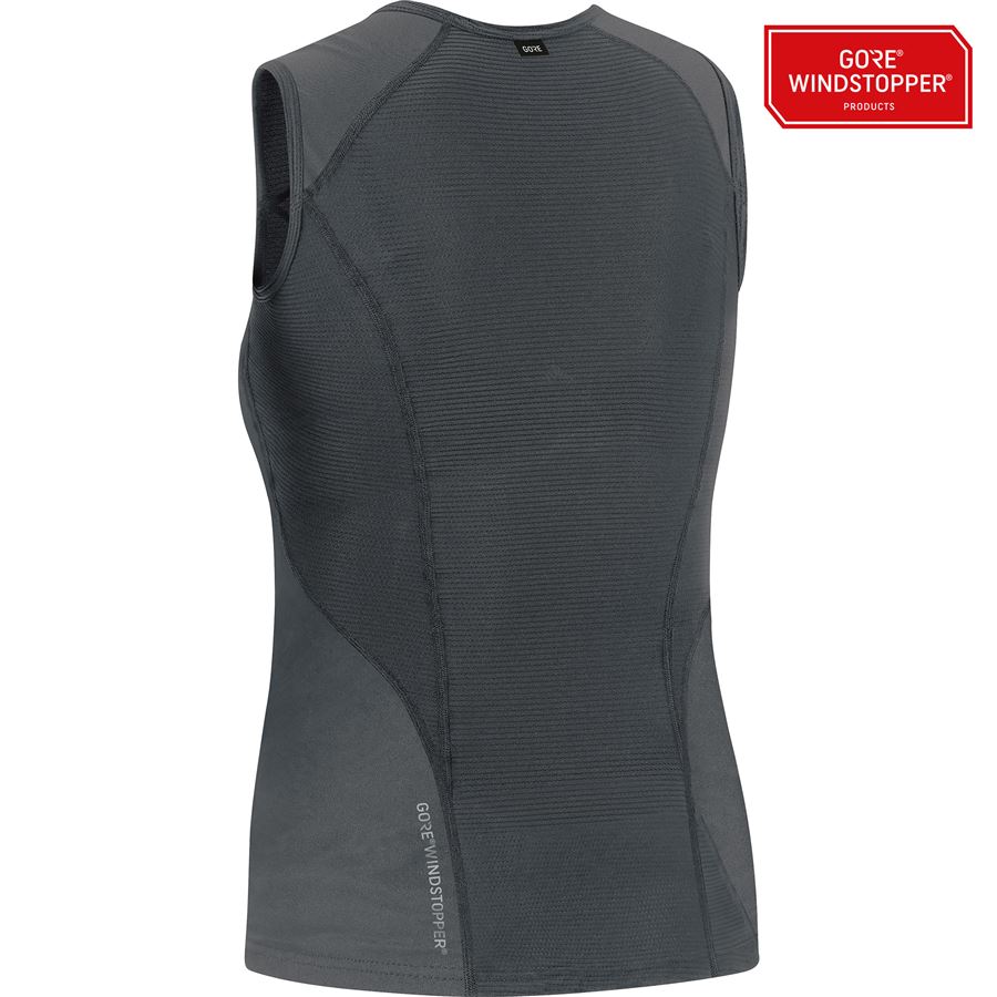 Materiály s GORE® WINDSTOPPER® membránou: zcela odolné vůči větru, velmi dobře prodyšné a odolné vůči lehčímu dešti, použití na přední straně tílka, přes ramena a v oblasti ledvin