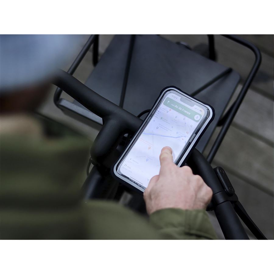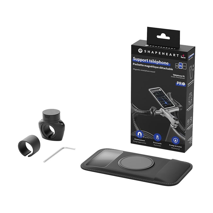 Šroubovací magnetický držák s pouzdrem na telefon pro použití na jízdním kole. Sada je dostupná ve 3 velikostech pouzdra podle velikosti telefonu (M, XL a XXL). Pouzdro na telefon je voděodolné, má průzor pro fotokameru a také vstup na sluchátka nebo USB, takže můžete telefon dokonce i za jízdy nabíjet. Samotný magnetický držák se upíná na řidítka nebo představec pomocí 2 šroubů a obejme řidítka o průměru 20-28 mm. Telefon lze snadno ovládat i v pouzdru, dotykový displej funguje i přes krycí fólii.
